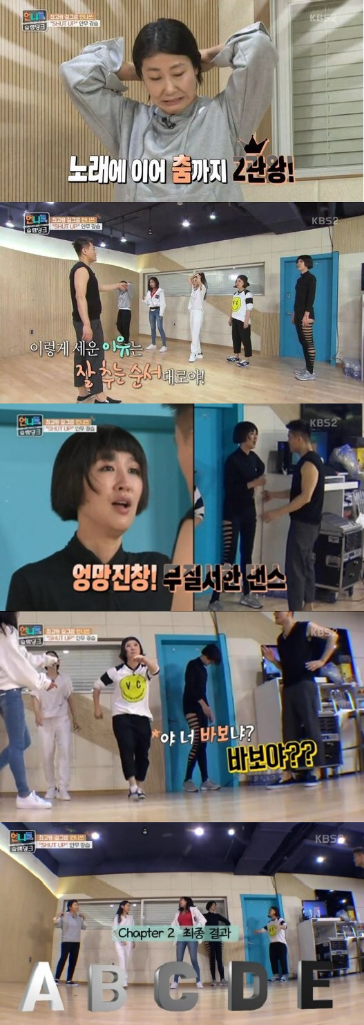 27일 방송된 KBS2 '언니들의 슬램덩크'에서는 지난 방송에 이어 걸그룹 '언니쓰' 데뷔(?)를 위해 본격적인 연습에 돌입한 멤버들의 모습이 담겼다. 특히 이날에는 '언니쓰'의 곡 'Shut up'의 안무가 첫 공개돼 눈길을 끌었다. 박진영의 시범을 본 멤버들은 "우리가 저걸 하는 거냐"며 불안해 하는 모습을 보였다.
