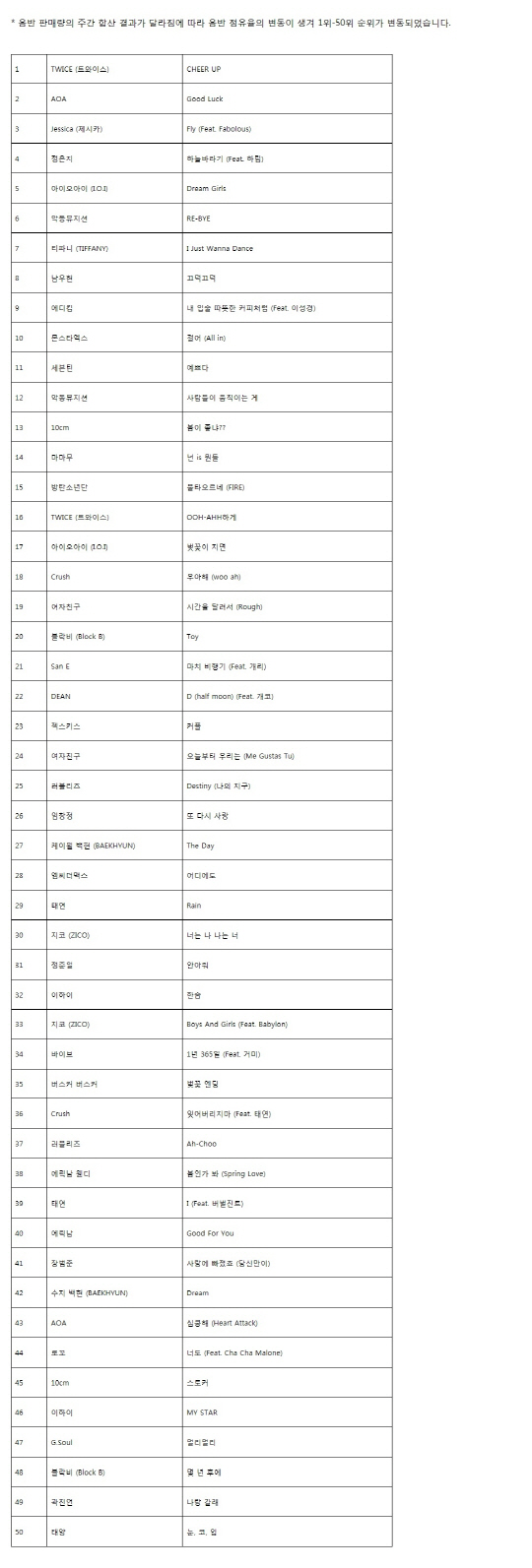 이와 함께 뮤직뱅크 측은 재검토된 K차트 순위를 다시 공지했다. 그 결과 지난 27일 방송된 '뮤직뱅크'에서 1위를 차지한 AOA가 2위로, 2위였던 트와이스가 1위에 올랐다.