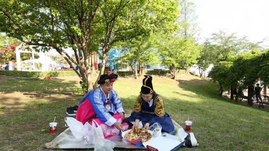 냉이꽃으로 내키지않는 프러포즈 시늉까지 마친 윤정수와 김숙은 박람회장 한 쪽에 마련된 궁중한복 체험장을 발견하고 왕과 왕비 한복을 입어보기도 했다.