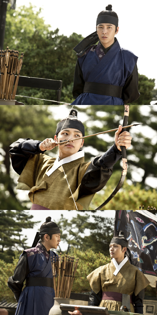공개된 사진 속 대길과 연잉군은 과거 숙종과 이인좌가 마주했던 활터에 나란히 서 있다. 두 사람은 번갈아 가며 활시위를 당기고 있다. 팽팽하게 당겨진 활시위, 날카로운 화살촉을 뽐내며 날아가는 화살 등이 아슬아슬한 긴장감을 조성한다. 무엇보다 눈길을 끄는 것은 서로를 바라보는 대길-연잉군 형제의 복잡하고도 불꽃 튀는 눈빛. 분노와 의심, 신뢰와 간절함 등 복잡한 감정이 뒤섞인 두 사람의 눈빛은 공기마저 압도하고 있다.