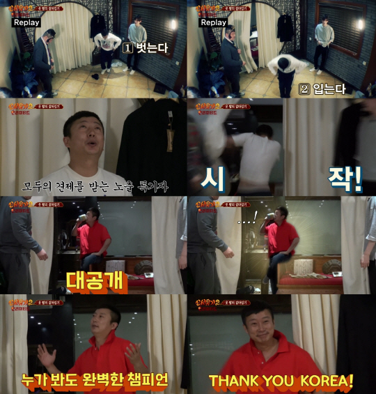 하지만 게임을 제안한 이수근은 맨 마지막 순서에 남다른 포스로 등장해 모두의 견제를 받았으며, 주어진 10초 안에 상의와 하의를 완벽하게 갈아입고 등장해 노출 특기자로서의 면모를 여과 없이 드러냈다.