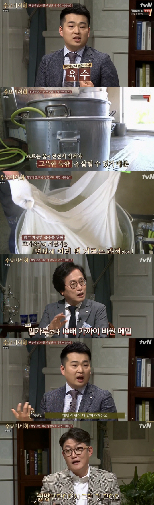 MC 신동엽은 "평양냉면이 보통 만원을 넘어간다. 일반 냉면의 두배 가격을 넘기도 한다. 왜이렇게 비싸냐"고 질문을 던졌고, 이원일 셰프는 "육수에 그 이유가 있다"고 말했다. 이 셰프는 "제대로 된 평양냉면은 육수를 끓이는데 이틀, 천천히 식히는데 2~3일, 면보로 계속해서 거르고 깨끗한 육수를 만들어내는게 쉬운 일이 아니다"라고 말했다. 이어 황교익 칼럼니스트는 "메밀의 가격이 높은 것에도 이유가 있다. 평양냉면에 들어가는 면에는 메밀이 70% 정도 들어간다. 메밀은 밀가루보다 10배 정도 높은 가격"이라고 덧붙였다.