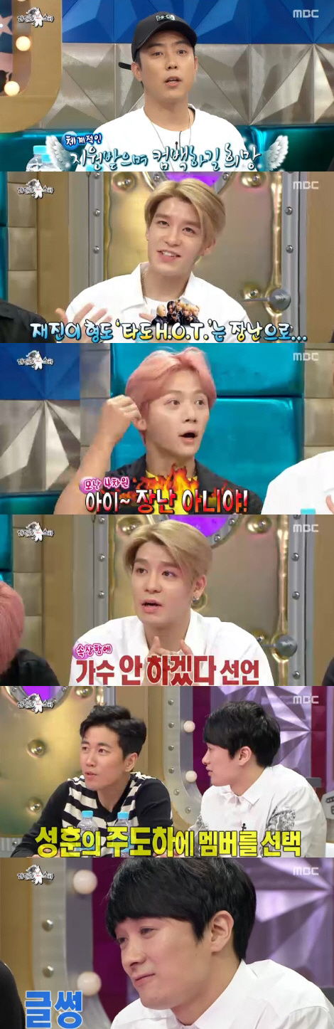강성훈은 "H.O.T.가 나오면 그때 당시는 전혀 이룰 수 없었던 합동 콘서트를 해보고 싶다"며 "이재진도 장난으로 '타도 H.O.T.'를 말하는 거다"고 말했다. 그러나 이재진은 "난 장난 아니다. 나와라"라며 한결같은 '타도 H.O.T.'임을 증명(?)했다. 이에 MC 김구라는 "H.O.T.도 회사에서 재결합을 추진하는데 한 명이 애를 먹인다고 하더라"고 말했고, 은지원은 "우린 고지용이 애먹인 건 아니다. 회사 생활을 하니까 그걸 고려하면 당연히 받아들여야 하는 거다"라고 설명했다.