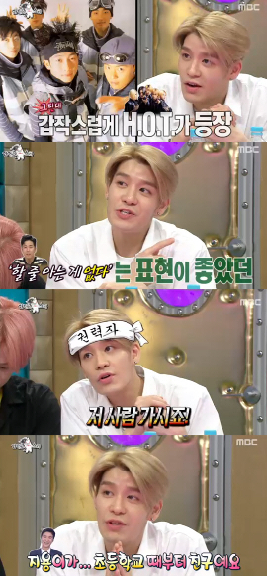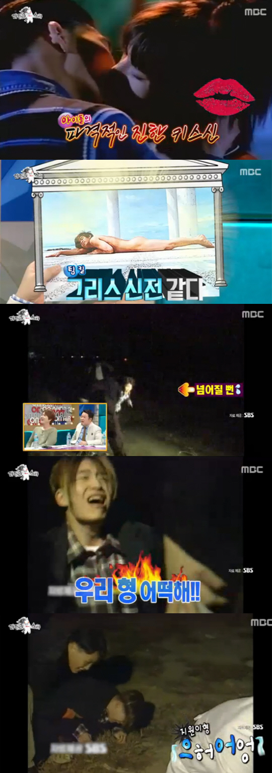 은지원은 "짧은 활동 기간에도 안해 본 예능이 없을 정도였다. H.O.T가 안하겠다고 한 건 우리가 다 했다고 보면 된다"며 과거 수영장에서 빈약한 몸매를 공개하고 삼각팬티를 입는 등의 흑역사 과거 예능 화면에 수줍어했다. 특히 과거 몰래카메라 영상은 충격이었다. 강성훈이 쏜 장난감 총에 은지원이 패러글라이딩에서 떨어져 죽는 파격적인 설정으로 구급차까지 등장했다. 강성훈은 은지원이 추락했다는 연기에 속아 대성통곡했고, 몰래카메라라는 것이 밝혀진 뒤에도 잠시 멍한 모습을 보여 눈물과 웃음을 줬다. 김구라는 "당시 예능이 엄청 셌다"며 "박수홍이 응급차에 타고 있다"고 말해 웃음을 유발했다.