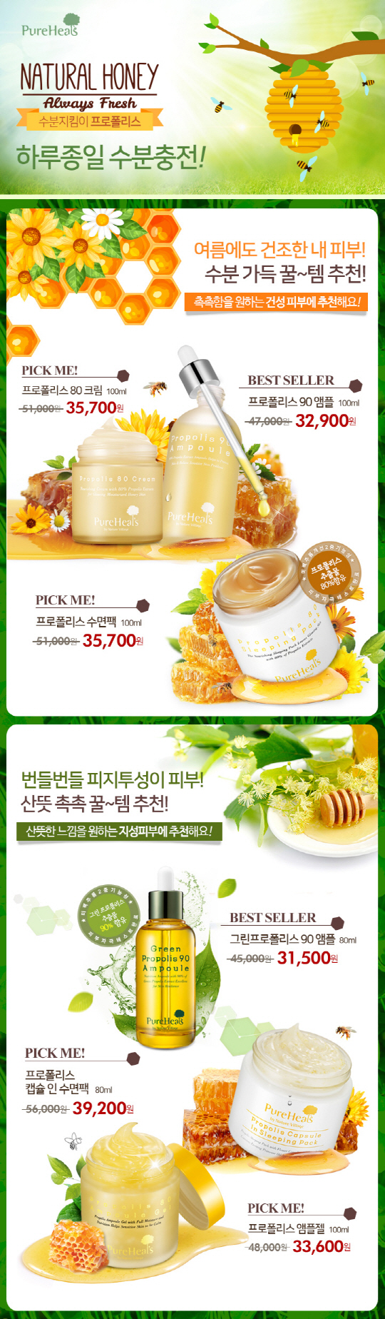 프로폴리스 라인은 자연에서 얻은 원료만을 담은 뷰티 브랜드 퓨어힐스의 대표 라인이다. 주성분인 프로폴리스는 벌들이 자신의 집을 지키기 위해 타액과 플라보노이드 성분을 섞어 만드는 천연 물질이다. 다양한 유기물과 미네랄, 비타민의 함유로 피부를 보호할 뿐 아니라 건조한 피부에 수분을 공급해준다.