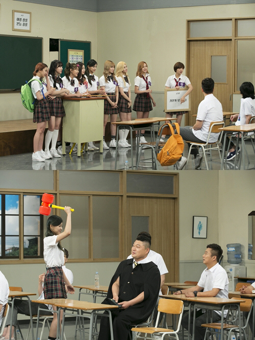 '아는 형님' 멤버들이 꿈쩍도 않자 트와이스는 "여기 SM도 있고 미스틱도 있는데 왜 JYP가 없냐"며 "JYP를 꽂기 위해 출연했다"는 당찬 발언으로 형님들을 놀라게 했다. 심지어 형님 학교의 급훈인 '재석을 기다리며'를 'JYP가 보고 있다'로 바꾸라는 깜찍한 협박까지 늘어놓았다. 이에 아는 형님 멤버들은 급훈을 바꾸며 트와이스의 지휘아래 움직이기 시작했다.