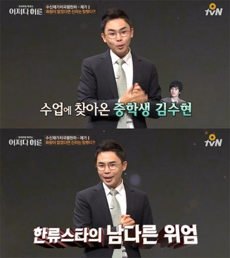 이어 설민석은 "당시 김수현은 중학생이었는데, 고등학생 역사 수업을 듣고 있더라"라며 "한류스타는 달라도 달라요"라고 덧붙였다.