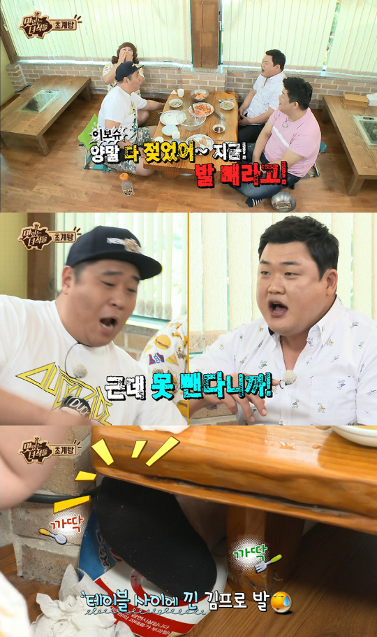좌식 테이블의 좁은 공간 때문에 양반 다리를 할 수 없었던 김준현은 다리를 뻗고 앉았으나 발이 테이블에 끼어 움직일 수 없었던 것.