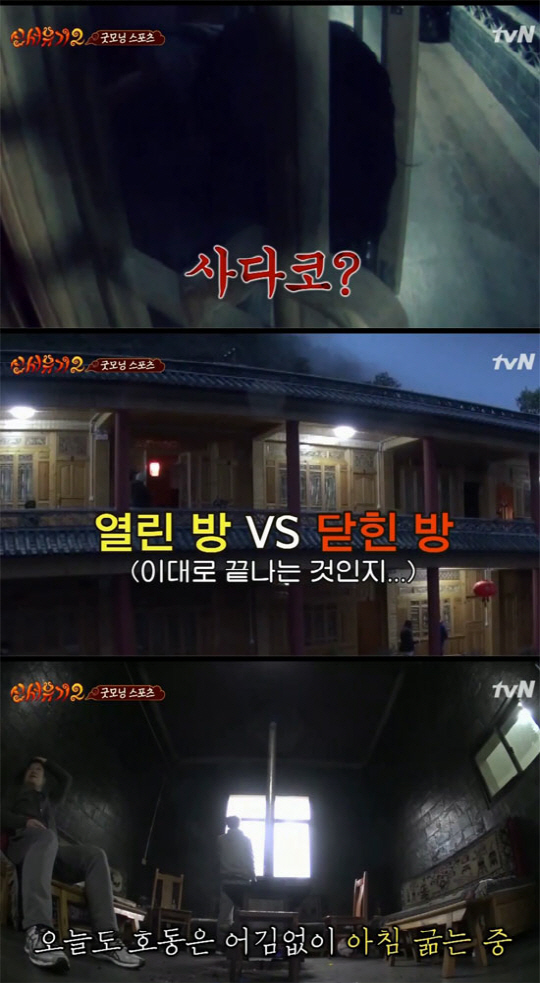 룸메이트 이수근, 은지원 팀과 안재현, 강호동이 팀을 이뤘다. 기상 미션에 앞선 새벽 숙소 창문에서 검은 머리에 음산한 움직임이 영화 '링'의 사다코를 연상케 했다. 알고보니 안재현인 것.