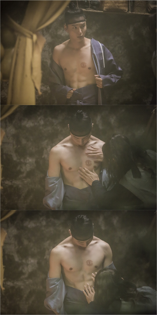 공개된 사진 속 윤시윤의 가슴에는 옥추경 무늬가 새겨져있다. 요광역의 이이경이 윤시윤의 상반신을 유심히 살피며 옥추경 무늬를 관찰하고 있다. 윤시윤의 가슴을 만지작 거리는 이이경의 모습에 다소 놀란 듯한 윤시윤의 모습이 웃음을 자아낸다. 두 사람이 선보이는 티격태격 브로맨스 케미 역시 기대감을 높인다. 윤시윤의 가슴에 새겨진 옥추경은 소격서 다섯 도사들이 홍주(염정아 분)의 흑주술을 막기 위해 교태전에서 방어진을 만들었던 바로 그 물건으로 영험한 힘을 가지고 있다. 약을 팔기 위해 궁에 들어갔던 허준은 비싼 값에 팔아보려 옥추경을 간직하고 있었고, 수발무녀의 화살 공격을 대신 막으며 목숨을 구했다. 화살이 가슴에 박혔을 때 옥추경이 이를 막으며 산산조각 나 사라졌지만, 그 기운이 허준에게 흡수되면서 가슴에 선명한 무늬가 새겨졌다.