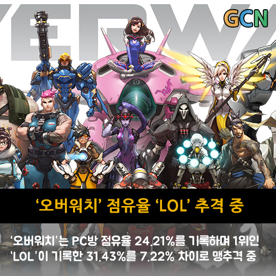'오버워치'는 PC방 점유율 24.21%를 기록하며 1위인 'LOL'이 기록한 31.43%를 7.22% 차이로 맹추격 중