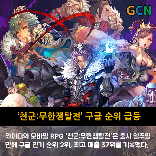 와이디의 모바일 RPG '천군:무한쟁탈전'은 출시 일주일 만에 구글 인기 순위 2위, 최고 매출 37위를 기록했다.