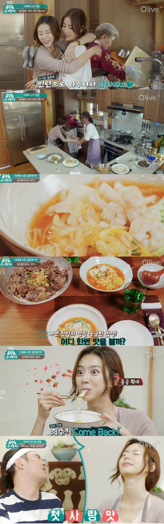 김치말이국수와 차돌박이 겉절이로 본격적인 요리가 시작됐다. 한 사람은 레시피를 받아 쓰고 한 사람은 심여사의 보조를 맡으며 분업했고, 긴장감을 떨어내고 음식이 완성된 순간 "와 주셔서 감사합니다"라고 인사하며 서로 포옹까지 할 정도로 마음이 맞았다.