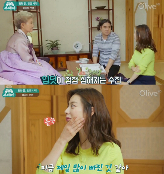 이날 김치말이 국수를 만들고 시식중이던 심영순은 박수진에게 부부싸움에 대해 물었고 "9개월동안 한번도 싸운 적이 없다. 물론 살짝 토라지거나 삐진 적은 있다"고 말했다. 이어 "남편이 주로 대화를 주도하고 풀어주려고 노력한다"고 덧붙였다. 이에 심영순은 "이런 보약같은 음식으로 보답하라"고 말했고, 박수진은 "거기에 약간의 애교를 더하겠다"고 말해 신혼의 달달함을 풍겼다. 박수진은 "임신 10주인데 입덧이 피크인것 같다. 길에 걸려있는 음식점 간판 보고도 입덧을 해서 요즘 살이 제일 많이 빠졌다"고 힘들어했다.