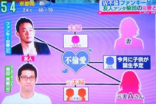 카토와 A는 약 1년 반 전 카토의 후배가 주최한 술자리에서 인연을 맺고 불륜 관계로 발전 됐다. 지난해 5월 A는 남편 시바타에게 카토와의 교제 사실을 고백하고 이혼을 하게 됐다. 또 같은 해 9월에는 A의 임신 사실이 밝혀졌다. A는 이달 출산 예정이다. 두 사람의 불륜과 임신 소식에도 카토 부부는 이혼 하지 않았고 태어나는 아이에게 양육비를 지원할 것을 약속했다.