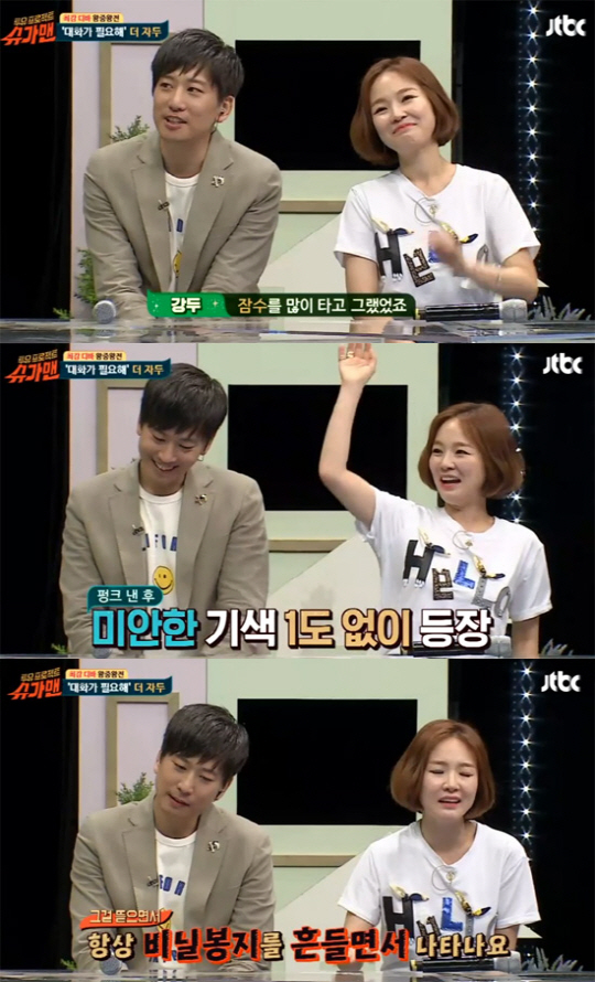 자두는 연신 한숨을 쉬며 "강두가 나타날 때 검은 봉지에 생라면, 만화책, 육포를 들고 다녔다"며 "항상 그걸 흔들면서 나타났다. 정말 기절하는 줄 알았다"고 말해 웃음을 더했다. <스포츠조선닷컴>