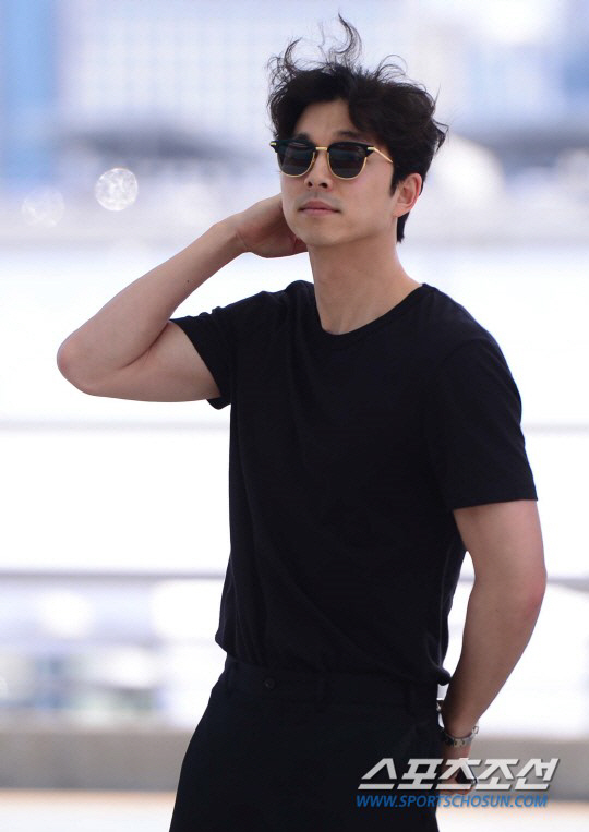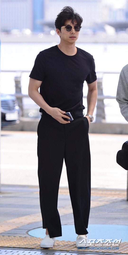 공유는 올블랙 패션을 선보였다. 상체에 핏되는 블랙 티셔츠와 발목을 덮는 오버핏의 블랙 팬츠는 편안한듯 하면서 남성미를 물씬 살린다. 화이트 컬러의 슬립온으로 화사한 컬러포인트를 살렸다. 메탈릭한 손목시계와 골드 컬러가 가미된 블랙 선글라스는 고급스러운 무드를 연출한다.