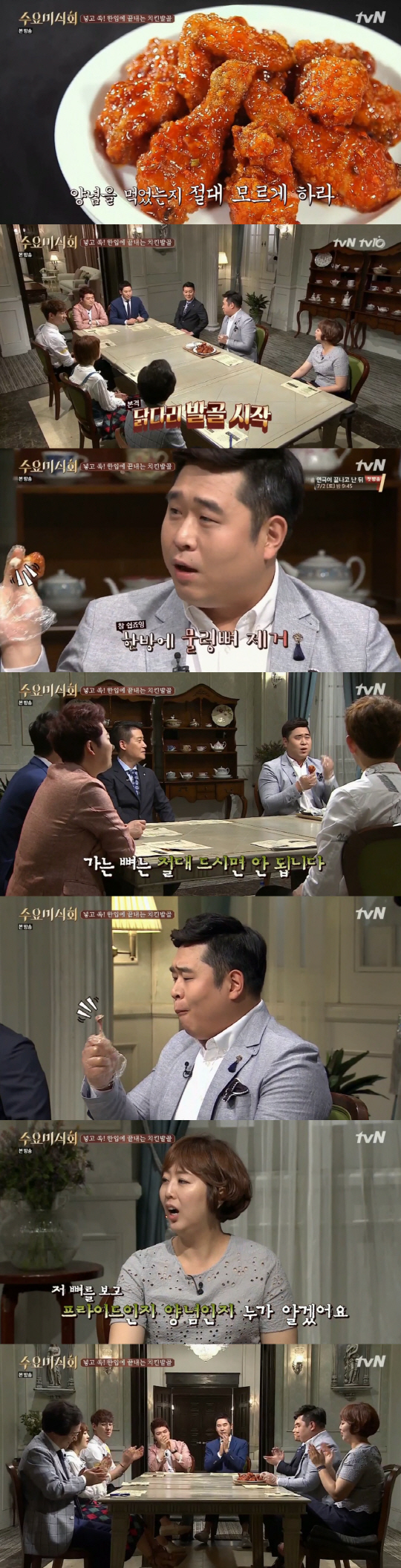 문세윤 입에 들어간 닭다리는 순식간에 뼈만 남았고 신동엽은 "저 뼈를 보고 프라이드인지 양념인지 어떻게 알겠냐"라면서 감탄했다.