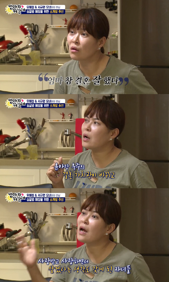 조혜련은 "사실 윤아랑 우주도 내가 재혼할 때 좋게 안 봤다. 그랬는데 아저씨랑 사는 것을 보면서 인정하기 시작했다. 심지어 우주가 '엄마 참 결혼 잘했다'라고 했다. 그리고 딸하고 아들의 결혼 가치관이 바뀌었다. (자녀들이) 저렇게 사랑받고 사랑하면서 사는 거다 라는 생각도 갖게 됐다. 엄마가 새로운 가정을 꾸려서 그 모습을 보여주는 게 좋더라"고 말했다.
