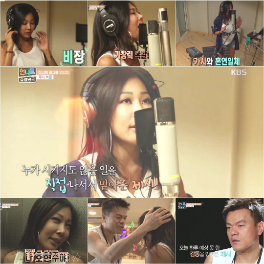 지난 27일 방송된 KBS 2TV'언니들의 슬램덩크' 10회에서는 걸그룹 '언니쓰-SHUT UP'의 녹음이 진행됐다. 지난 주 제시는 가사를 암기해오지 못해 박진영으로부터 "노력이 너무 부족해"라는 평을 들었다. 그런 가운데 진행된 녹음에서 제시는 180도 달라진 모습으로 녹음에 임해 박진영을 깜짝 놀라게했다. 비장한 각오로 녹음실에 들어간 제시는 가사를 다 암기한 것은 물론 자신감 넘치는 가창력을 뽐냈다. 이에 박진영은 깜짝 놀람과 동시에 황홀한 미소를 지으며 미국의 유명한 팝가수 "메리제이 블라이즈 같아"라며 극찬을 아끼지 않았다.
