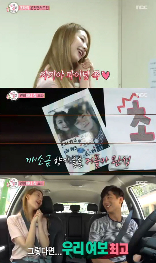 운전면허 기념으로 세차장으로 향하던 조타는 합격 기념 애교를 주문했다. 신호가 멈출 때 마다 안절부절하던 김진경은 ""우리 여보 최고"라며 또 한번 짧고 굵은 애교를 보였다. 조타는 "완전 귀여웠어요. 마음 같아선 몇번이나 보고 싶었다. 다음에도 꼭 보고싶다"라고 바람을 드러냈다.