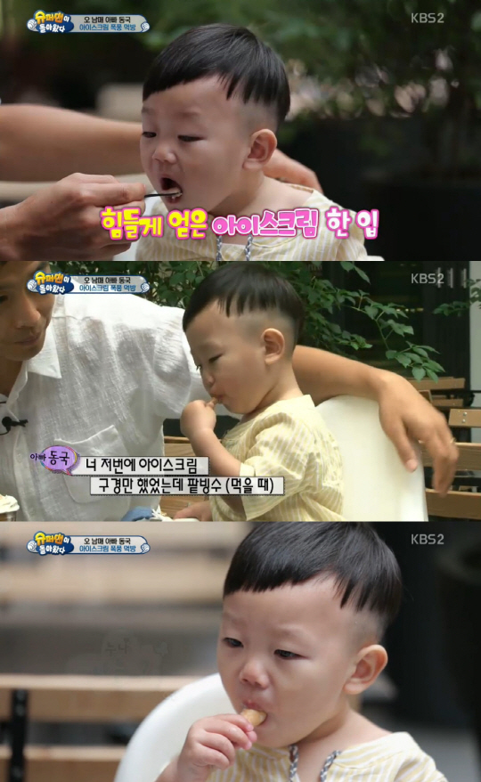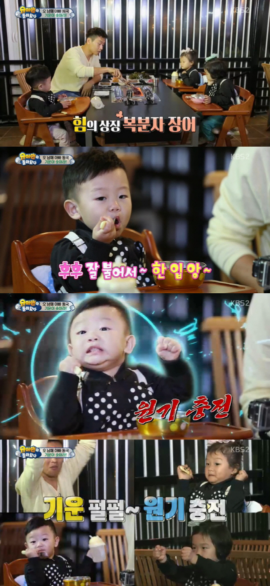 [스포츠조선닷컴 정유나 기자] '슈퍼맨이 돌아왔다' 대박이가 사랑스러운 먹방을 선보였다. 불과 1년사이에 다양한 음식을 맛있게 먹는 모습은 대박이의 성장을 실감케 한다.