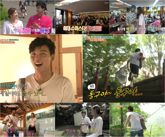 [스포츠조선닷컴 이지현 기자] '1박 2일' 윤시윤이 이화여대 슈퍼스타에 등극했다. 그는 VJ를 당황하게 만드는 날쌘 달리기 실력으로 캠퍼스 곳곳을 누벼 모두를 놀라게 했고, 똑 부러지는 '벗님'의 설명 덕에 한결 쉽게 복불복 미션을 수행해 시청자들의 이목을 사로잡았다.