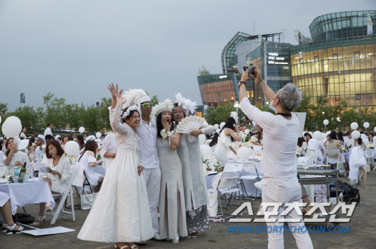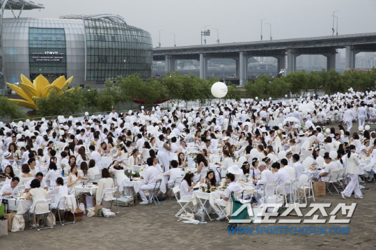 지난 11일 오후 7시 서울 반포한강공원에서 1200여명의 파티 참가자들이 모인 가운데 디네앙블랑 서울이 개최됐다. 디네앙블랑은 프랑스에서 시작된 궁정문화를 재현, 음식과 패션, 엔터테인먼트 등을 즐기는 복합문화행사다. 모든 참가자는 흰색 드레스 코드를 맞춰야 할 뿐 아니라, 테이블과 집기류 등 파티에 필요한 모든 물품을 직접 준비해야 하는 행사다. 이같은 이색 미션으로 행사시적 2시간 전부터 흰색 옷을 입은 사람들이 떼지어 짐을 끌고 다니는 모습에 구경객들이 몰리기도 했다.