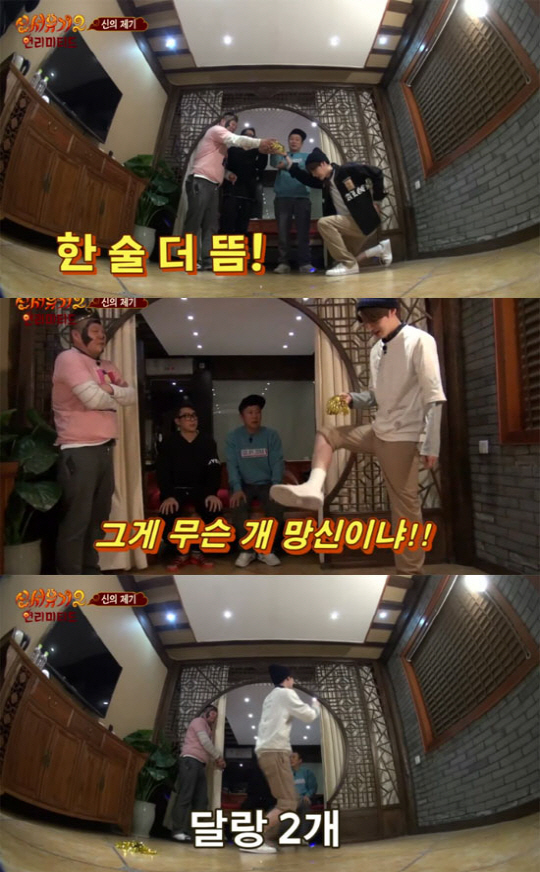 이날 첫 번째 게임은 안재현이 맡게 됐다. 안재현에게 게임종목인 제기를 던지자, 겁먹은 안재현은 제작진에게 제기를 던지며 거부했다. 안재현의 부실한 하체에 이수근은 "안재현은 다리를 걷는데만 쓴다"라고 변호했지만, 제작진은 "단 3개만 차면된다"라고 설득했다.