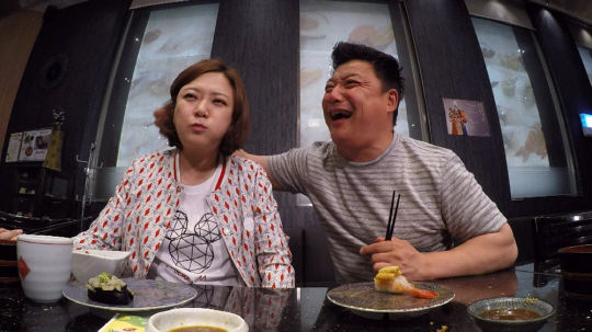 평소 내기를 즐기던 두 사람은 이후 식사비용 계산을 걸고 초밥 접시 높이 쌓기 대결을 시작했다. '동해 바다 출신' 윤정수와 '남해 바다 출신' 김숙의 자존심을 건 초밥 먹기 대결로 식당이 초토화됐다는 후문이다.