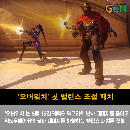 '오버워치'는 6월 15일 캐릭터 맥크리의 난사 대미지를 줄이고 위도우메이커의 평타 대미지를 하향하는 밸런스 패치를 진행