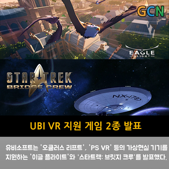 유비소프트는 '오큘러스 리프트', 'PS VR' 등의 가상현실 기기를 지원하는 '이글 플라이트'와 '스타트랙: 브릿지 크루'를 발표했다.