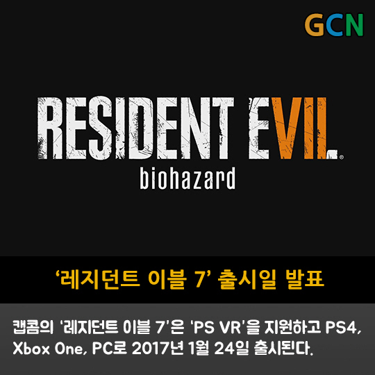 캡콤의 '레지던트 이블 7'은 'PS VR'을 지원하고 PS4, Xbox One, PC로 2017년 1월 24일 출시된다.