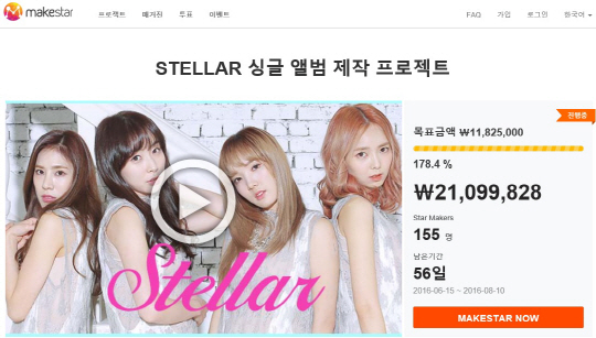 [스포츠조선 고재완 기자] 걸그룹 스텔라의 두번째 크라우드펀딩 프로젝트가 시작한지 30분만에 100% 돌파해 화제가 되고 있다.