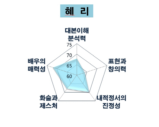가장 아쉬운 점수를 받았던 부문은 무엇일까. 표현과 창의력 부문이었다. 대다수 자문단들이 낮은 점수를 줬다. #내공부족 #입체성부족 등 자문단들의 한줄평 키워드에서도 표현력, 창의력 부족이 느껴진다. 다만, 윤상원 연출가는 "혜리는 자신이 잘 할 수 있는 연기를 잘 알고 있다"고 평가하기도 했다. 김태훈 세종 액팅클리닉 연구소 소장과 배진성 세종 액팅 클리닉 연구소 연구원은 "표현의 담백함과 깔끔함이 자칫 입체성 부족과 평이함으로 구현될 수 있으니 각별히 유의"라고 평가하기도 했다.