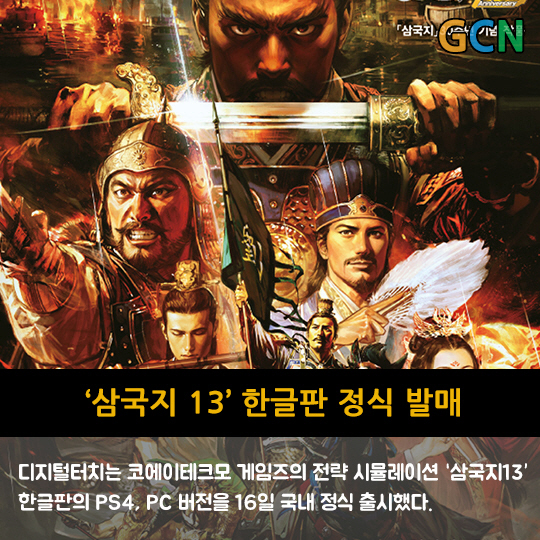 디지털터치는 코에이테크모 게임즈의 전략 시뮬레이션 '삼국지13' 한글판의 PS4, PC 버전을 16일 국내 정식 출시했다.