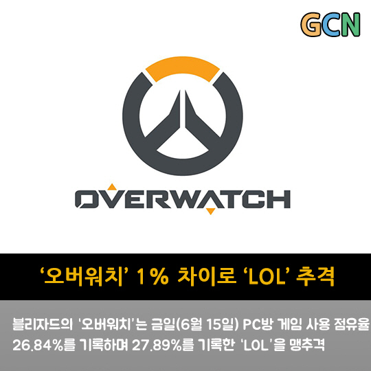 블리자드의 '오버워치'는 금일(6월 15일) PC방 게임 사용 점유율 26.84%를 기록하며 27.89%를 기록한 'LOL'을 맹추격