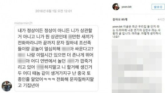 일찌기 "SNS는 인생의 낭비"라고 촌철살인 한 알렉스 퍼거슨 전 맨유 감독의 말은 역시 진리? 17일 오후 국가대표 미드필더 윤빛가람은 자신의 인스타그램을 통해 배우 김민수의 것으로 추정되는 욕설 메시지를 폭로했다. 메시지에는 "X만한 새끼", "조선족", "기집X"등의 거친 욕설과 인신공격성 발언이 포함됐다. 네티즌들은 "욕설을 보낸 건 너무 심했다", "해킹 당한 거 아니냐", "윤빛가람이 앞뒤 다 자르고 공개한 일부 내용만으로는 상황을 판단하기가 어렵다"등의 반응이다. 소속팀인 중국 1부리그 옌벤 푸더 팬들까지 싸잡아 모욕한 발언에 피 뜨거운 축구선수는 참지 않았다. 폭로 후 논란이 불거지자 해당 캡처본을 모자이크 처리했다. 둘 사이에 주고받은 메시지 내용에 대한 궁금증과 함께 논란이 증폭됐다.