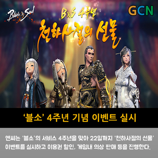 엔씨는 '블소'의 서비스 4주년을 맞아 22일까지 '천하사절의 선물' 이벤트를 실시하고 이용권 할인, 게임내 의상 판매 등을 진행한다.