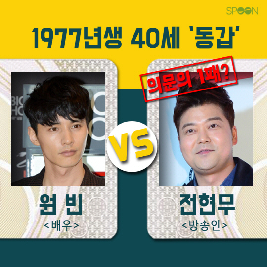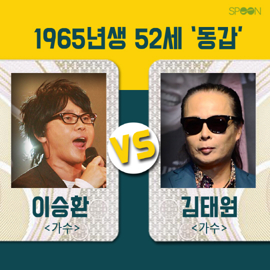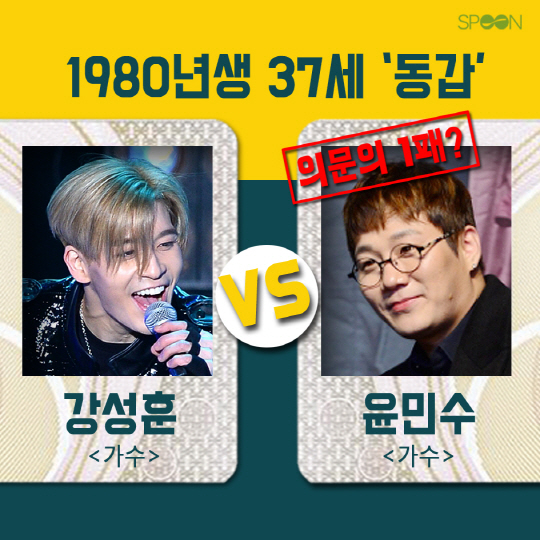 #. 지난 6월 12일 SBS '판타스틱듀오', '젝키 보컬' 강성훈과 '윤후 아빠' 윤민수가 1980년생 동갑내기라는 사실이 처음으로 알려졌다. 2월생인 윤민수가 "난 빠른~"이라며 빠져나가려 하자, 2월생인 강성훈도 질세라 "나도 빠른!"을 외쳤다. '동갑내기' 친구는 손을 맞잡았다. 세월을 거스르는 '절대동안' 스타 VS '의문의 1패' 스타, 연예 방송계에서 가장 판타스틱한 '동갑내기 반전 듀오'를 엄선했다.