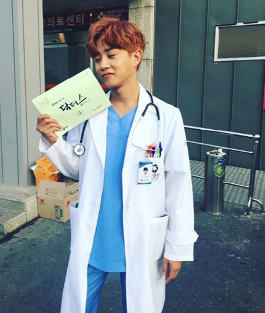 의사 가운을 입고 있는 그는 '닥터스' 대본을 들고 인증샷을 찍으며 '닥터스'의 본방 사수를 독려했다.