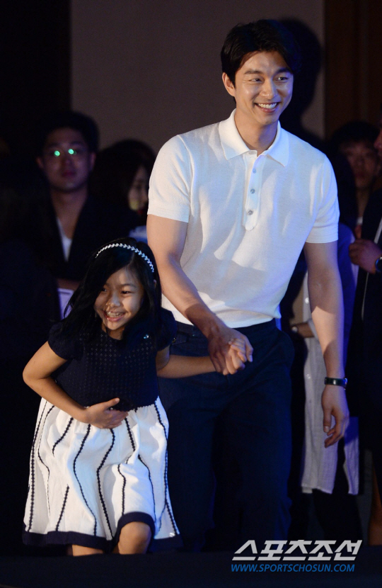 영화 '부산행'의 제작보고회가 21일 그랑서울에서 열렸다. 공유와 아역배우 김수안이 무대로 입장하고 있다. 영화