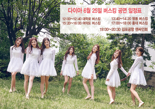 다이아는 24일부터 진행되는 모든 일정에 다이아가 새겨진 랩핑버스로 이동할 예정이며 버스킹과 팬싸인회 현장에 함께하는 팬들을 위한 작은 선물도 함께 준비해 나눠줄 예정이다.