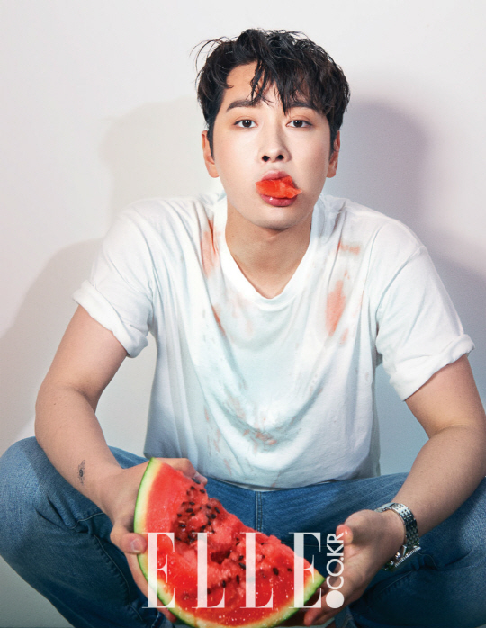 얼룩진 티셔츠를 입고 수박을 크게 베어 문 컷에서는 악동 같은 분위기가 물씬 풍긴다.