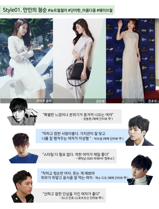 모든 남자가 마다할 이유가 없을 청순하고 여성스러운 여자. 요즘 대세 남자 스타들도 모두 하나같이 청순하고 참한 스타일을 이상형으로 꼽았습니다. 청순한 여성이 되기 위해 여자 스타들이 선택한 것은 바로 뉴트럴 컬러였어요. 채도가 낮은 뉴트럴 컬러를 활용한 스타일링은 차분하며 단아한 분위기를 연출할 수 있는 가장 좋은 방법인데요. 특히 원피스 같은 경우에는 길이에 따라 소녀감성 또는 우아한 아름다움을 낼 수 있어요.