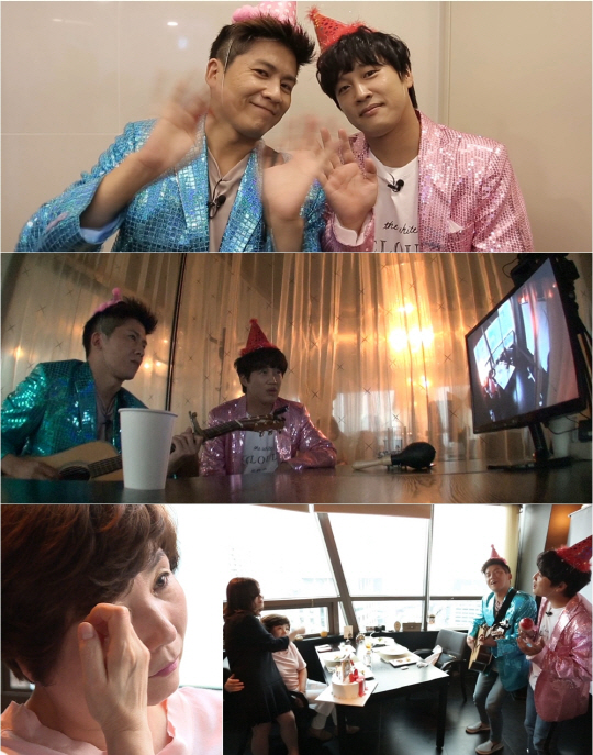 그런 가운데 공개된 스틸 속에는 차태현-홍경민이 귀여운 고깔모자를 쓰고, 반짝이 자켓을 입은 채, 악기를 들고 공연을 하고 있는 듯한 모습이 담겨있어 웃음을 유발한다. 이와 함께 두 사람이 사뭇 비장한 표정으로 모니터에 떠오른 화면을 유심히 지켜보고 있는 모습 또한 포착돼 무슨 상황인지 궁금증을 자극한다.