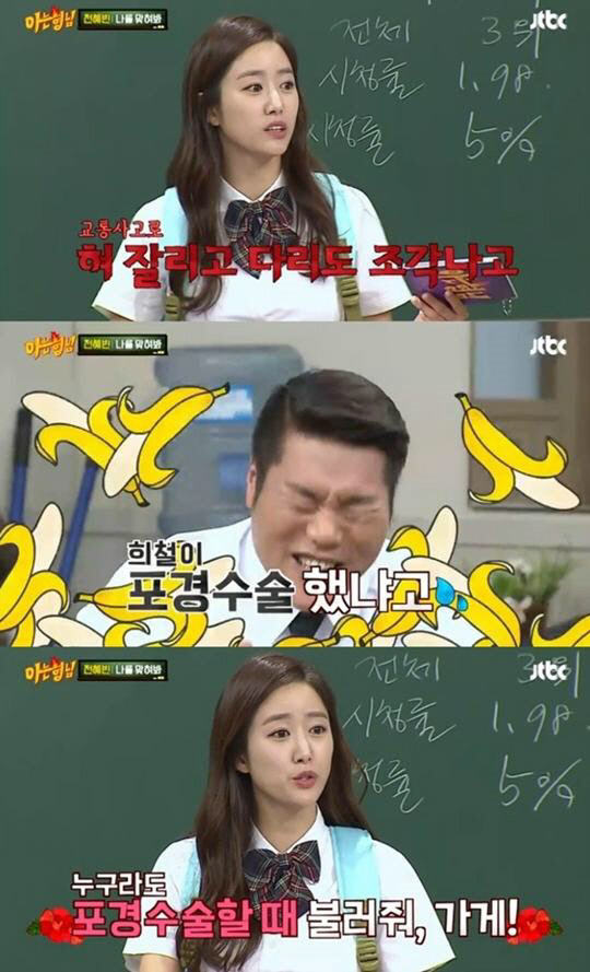 이에 서장훈이 "어디가 아파서 병문안을 간 거냐"고 묻자 전혜빈은 "김희철이 사고 나서 혀 잘리고 다리도 조각났다"고 거침없이 말했다. 그러자 김희철은 "혀가 찢어진 거지 잘린 건 아니다. 잘리면 요단강 건너지 않느냐"고 설명했다.