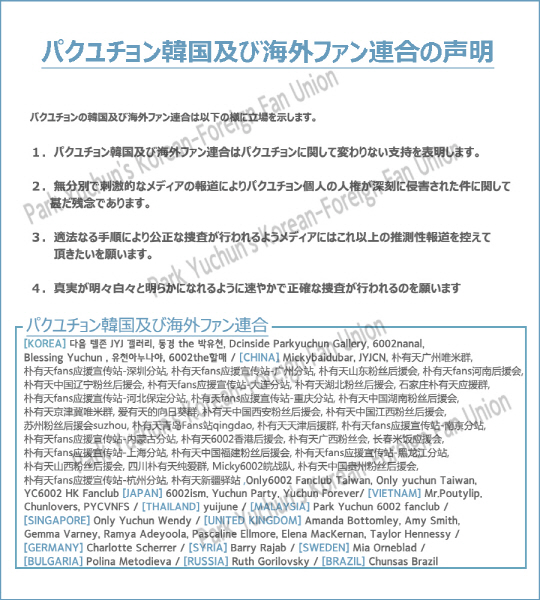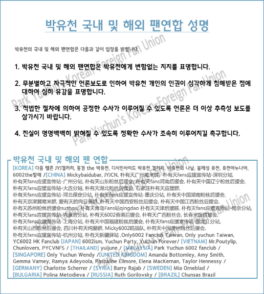 [스포츠조선 백지은 기자] JYJ 겸 배우 박유천의 국내외 팬연합이 성추문에도 불구하고 박유천에 대한 지지 입장을 밝혔다.