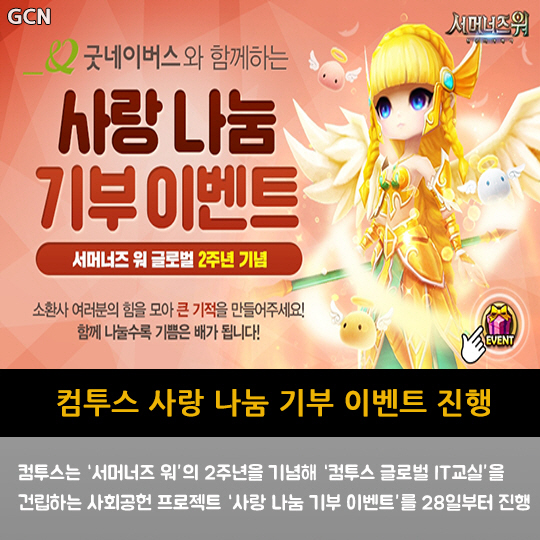컴투스는 '서머너즈 워'의 2주년을 기념해 '컴투스 글로벌 IT교실'을 건립하는 사회공헌 프로젝트 '사랑 나눔 기부 이벤트'를 28일부터 진행