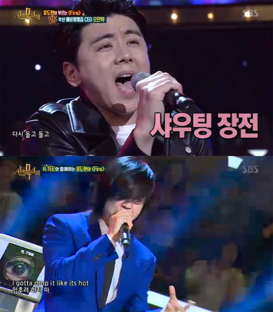 오인탁은 윤도현의 '돌고돌고돌고'를 선곡했다. 윤도현 못지 않는 카리스마라 샤우팅으로 시원한 무대를 만들었다. 거침없는 샤우팅은 앉아 있던 신들마저 들썩이게 했고, 감성까지 갖춘 그의 목소리에 모두가 집중했다.